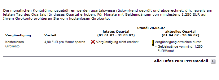 Gerade logge ich mich zum ersten Mal in unser neu eröffnetes Gemeinschaftskonto ein. Dem Bereich “Vergünstigungen” entnehme ich, dass monatl. ein Betrag von 4,90 EUR berechnet werden soll, wenn nicht Geldeingänge von mind. 1.250 EUR verzeichnet werden.