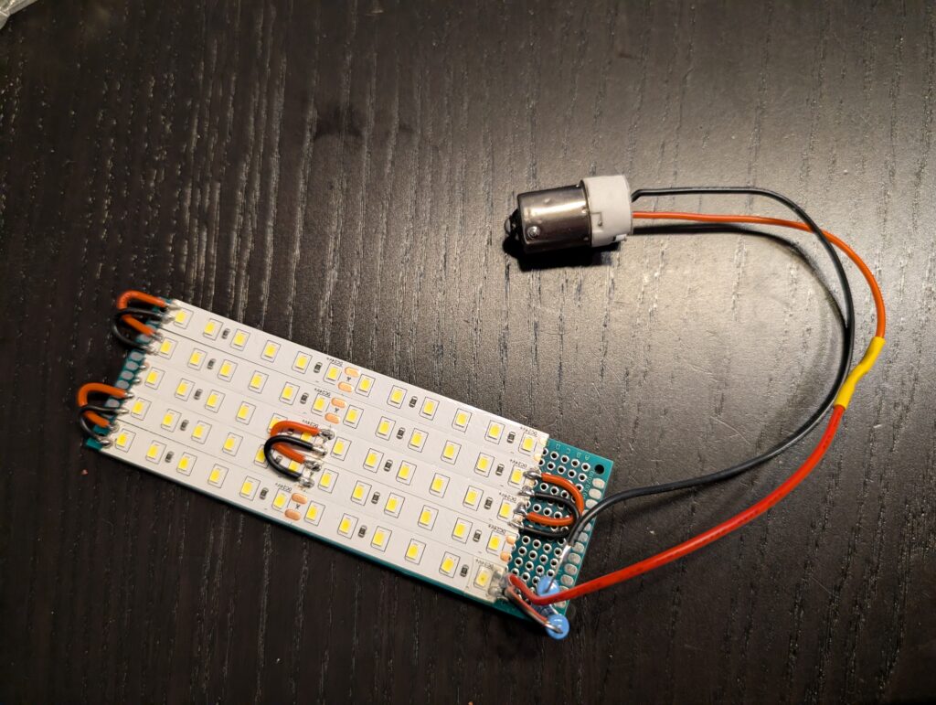 Ich habe also eine “Matrix” bestehend aus jeweils zwei Elementen horizontal mal fünf vertikal gebaut, also 10 Elemente. Die LED-Streifen habe ich dabei auf eine Lochrasterplatine aufgeklebt. Bei maximaler Helligkeit ergibt sich eine Lichtleistung von 5,5 Watt. Da die Versorgungsspannung seitens der Sommer-Steuerung 32 Volt (gemessen bei mir 33 Volt) beträgt, musste noch ein Vorwiderstand berechnet werden, damit die “überschüssigen” 8-9 Volt dort abfallen und lediglich die gewünschte Versorgungsspannung von 24 Volt an dem Leuchtenelement anliegt.