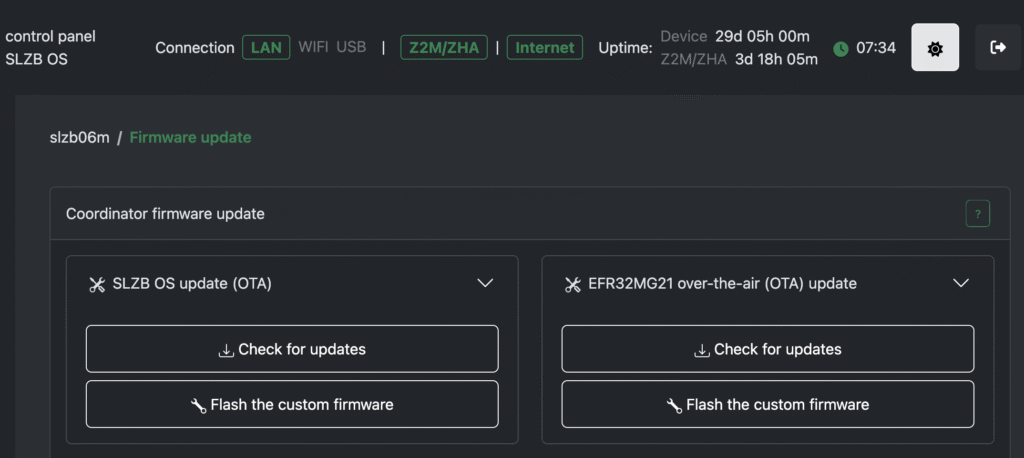 Firmware-Updates (sowohl für den eingebauten Mikrocontroller bzw. dessen “SLZB-OS” als auch für die Zigbee-/Thread-Radios) können kinderleicht über das integrierte Web-Interface installiert werden:
