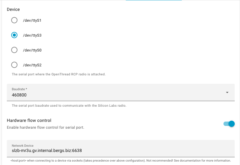 Für die Kommunikation des Border Routers mit dem SLZB muss der Hostname bzw. die IP-Adresse sowie die Portnummer angegeben werden. Der serielle Port wird bei diesem Setup nicht benutzt, hier kann also einfach ein Dummy-Wert ausgewählt werden: